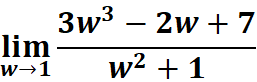 # 1st: Import necessary functions from sympy from sympy import symbols, limit # 2nd: Define the symbolic variable and expression w = symbols('w') # Declare 'w' as a symbolic variable expression = (3*w**3 - 2*w + 7) / (w**2 + 1) # Define the function to calculate the limit # 3rd: Calculate the limit as w approaches 1 lim_result = limit(expression, w, 1) # Compute the limit of the expression as w -> 1 # 4th: Output the result using custom print for LaTeX rendering print(lim_result) # Print the result of the limit calculation