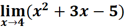 # 1st: Import necessary functions from sympy from sympy import symbols, limit # 2nd: Define the symbolic variable and function x = symbols('x') # Declare 'x' as a symbolic variable f = x**2 + 3*x - 5 # Define the function f(x) = x² + 3x - 5 # 3rd: Calculate the limit as x approaches 4 lim_result = limit(f, x, 4) # Compute the limit of f(x) as x → 4 # 4th: Output the result print(lim_result) # Print the computed limit result