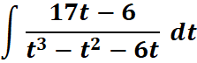 # 1st: Import the sympy module import sympy as sp # Import sympy for symbolic computation # 2nd: Define the variable 't' t = sp.symbols('t') # Define the symbolic variable 't' # 3rd: Define the integrand integrand = (17 * t - 6) / (t**3 - t**2 - 6 * t) # Define the function to integrate # 4th: Perform the integration with respect to 't' integral_result = sp.integrate(integrand, t) # Compute the integral # 5th: Display the result print(integral_result) # Print the result of the integral