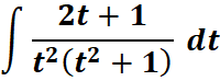 # 1st: Import the sympy module import sympy as sp # Import sympy for symbolic computation # 2nd: Define the variable and the function t = sp.symbols('t') # Define the symbolic variable 't' f = (2*t + 1) / (t**2 * (t**2 + 1)) # Define the function to integrate # 3rd: Perform partial fraction decomposition decomp = sp.apart(f) # Compute the partial fraction decomposition # 4th: Compute the integral of the decomposed expression integral = sp.integrate(decomp, t) # Perform the integration # 5th: Output the result print("The integral is:", integral) # Print the result of the integral